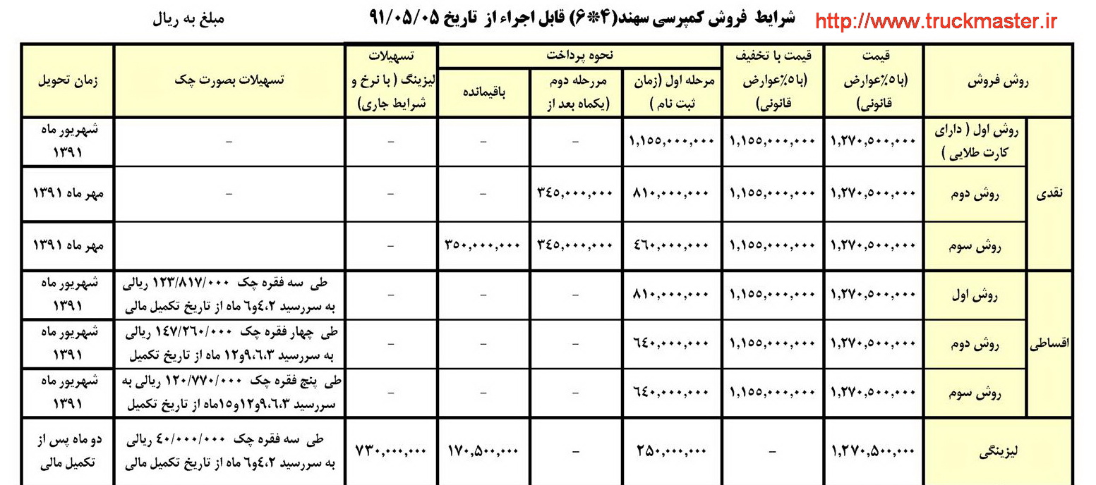 فروش نقدی و اقساطی کمپرسی (4*6) لطفا جدول زیر را مشاهده نمایید